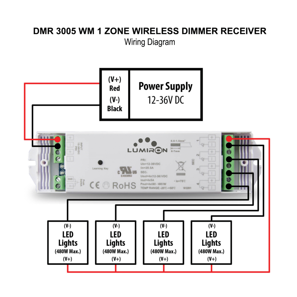 DMR 3005 WM 1 Zone Wireless Dimmer Receiver has been designed to bring light control easily. No wires or switch box locations are needed, just stick or mount it to any flat location such as walls or cabinets. The simple modern design and elegant Ivory White surface complement a variety of LED projects. The dimmer switch features smooth and accurate dimming from 0.1%-100% without any flickering. It can also control up to four single colors LED fixtures at once, for LED lights at either 12VDC or 24VDC. After the installation is complete, you can change the brightness from 0% to 100% brightness. It runs on a single internal 3V CR2430 battery (included) and includes a receiver. The wireless design saves time and energy by requiring no cabling or installation to pair it with the LED zone. It is IP20, please avoid the sun and rain. When installed outdoors, please ensure it is mounted in a waterproof enclosure. Always be sure to mount it in an area with proper ventilation to avoid overheating. It is easy to install and operate and will provide many years of easy operation.