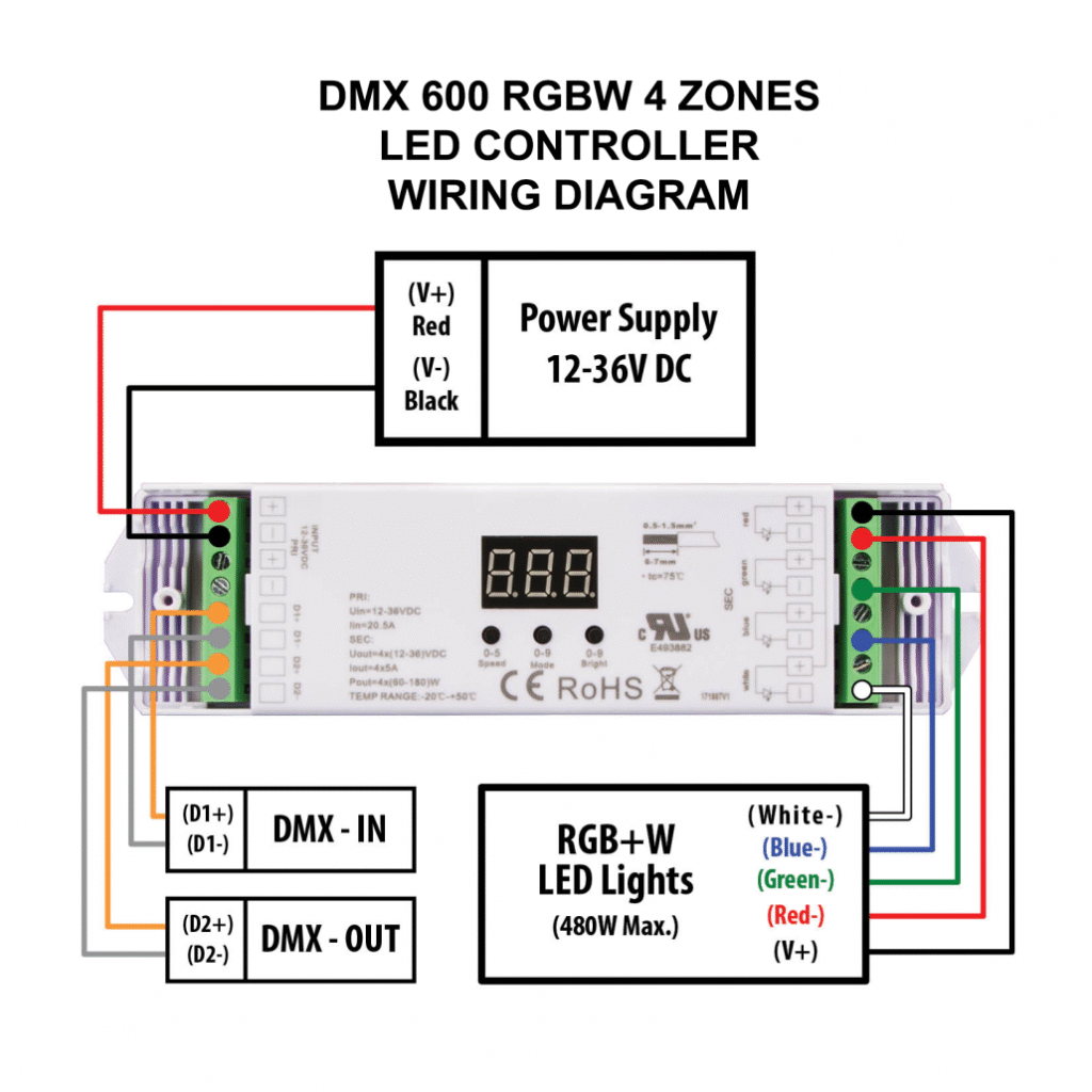 The DMX 600 RGBW 4 Zones LED Controller works also as an RGB controller when no DMX signal is present. It includes 10 Different LED Color Changing programs when using it in standalone mode.