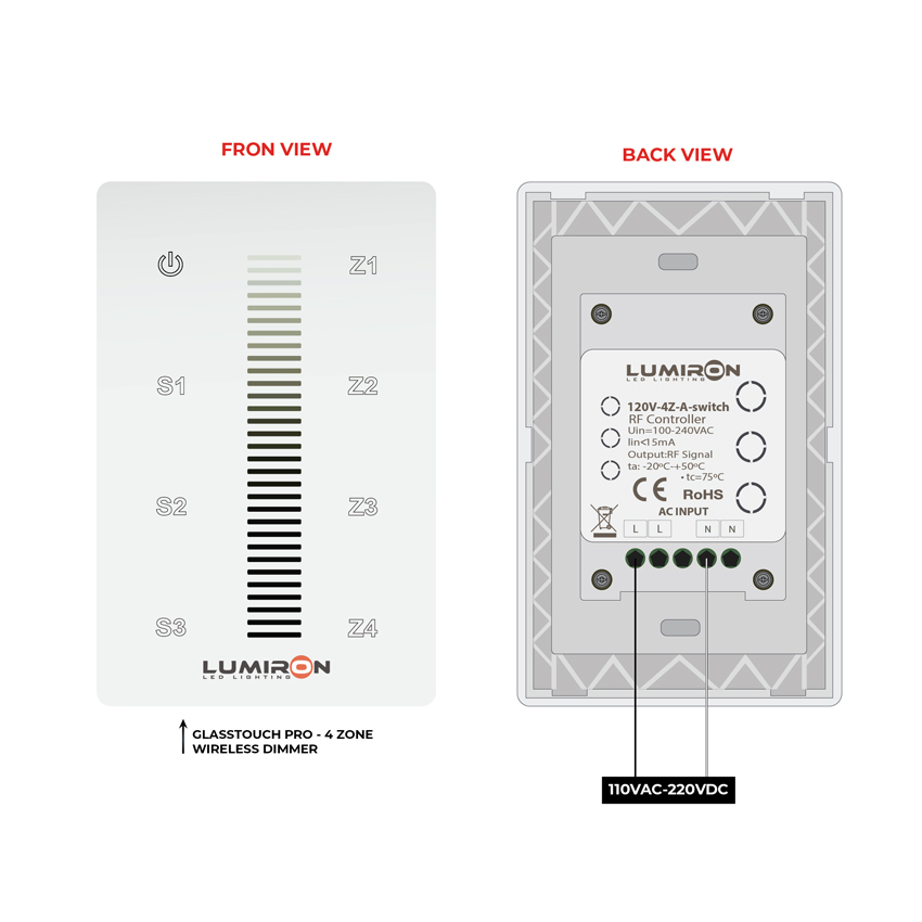 Experience elegance and ultimate control with the GlassTouch Pro-S 4-Zone 120V AC Wireless Dimmer Wall Switch/Controller. This revolutionary device combines modern, sophisticated design with advanced features to provide you with an unparalleled lighting experience.