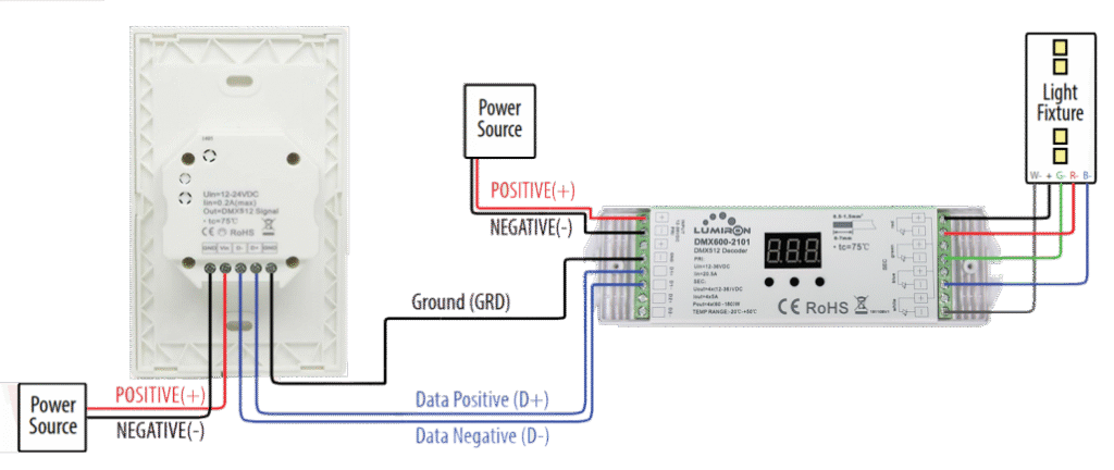 The In Wall DMX Wireless RGBW Controller is perfect for DMX enabled LED Lights, such as LED Wall Washers and LED Flood Lights. With the wireless option connecting to non-DMX LED fixtures such as LED Strip Lights and LED Light Bars is easy to do, as there is a 50-foot wireless range. To connect using the wireless feature a matching receiver is required. The wireless option makes installation easier than ever, as no extra wiring is required saving time and energy. The main features are: